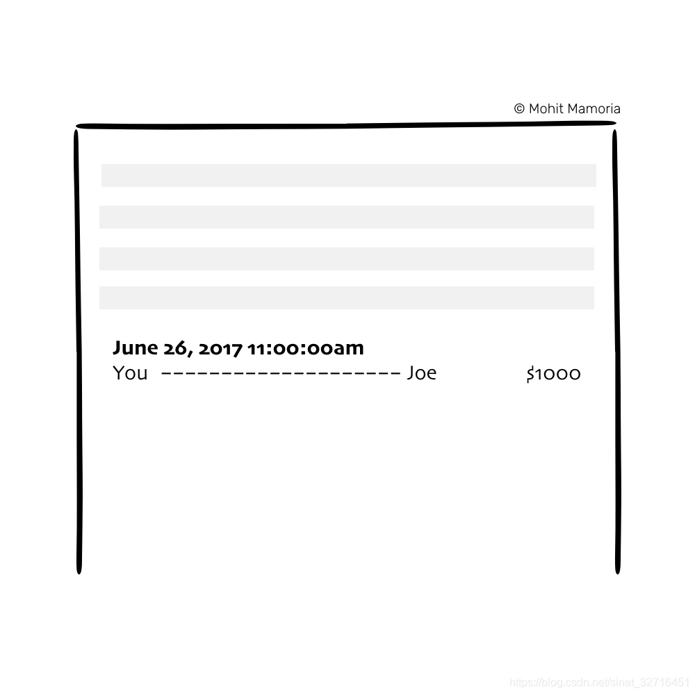他打开登记表,检查你的账户余额看是否有足够的余额能够转给Joe$1000。因为你是一个土豪,你有充足的金钱,所以,他在登记表中做了一个如下的记录:
