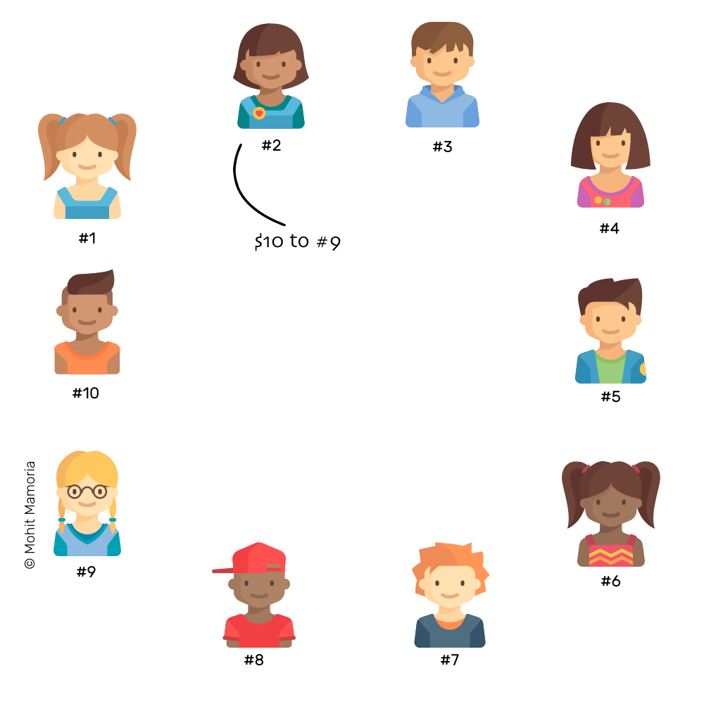 每个人检查#2是否有足够的余额可以转给#9 10$。如果有足够余额,那么每个人在自己的空白纸上记录一条交易。