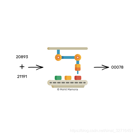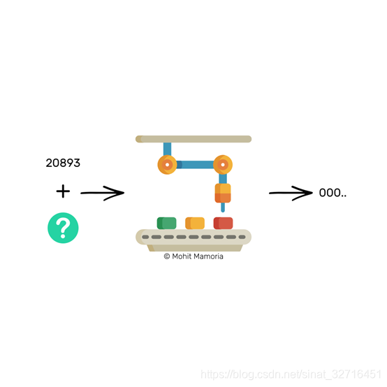 假设我给你两个盒子。第一个框包含数字20893。然后,我问你:“你能想出一个数字吗?当它与第一个盒子里的数字相加,然后输入到机器里,它会给出一个以三个前导0开头的单词。”