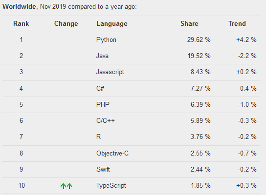 2019年转眼已经接近尾声,在近一年的编程语言榜单中,Python已经走上卫冕的道路,并且与Java的差距拉得更远了一些。以往与Java常呈现你追我赶之势,而这一次则是直接相差了近10%!