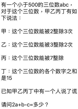 所以乙错了,甲丙丁是对的,此时 abc 能被 8(甲)、7(丙)、3(丁)整除,则 abc 是 8*7*3=168 的倍数。小于 500 的 168 的倍数有 168、336,只有 1+6+8=15。