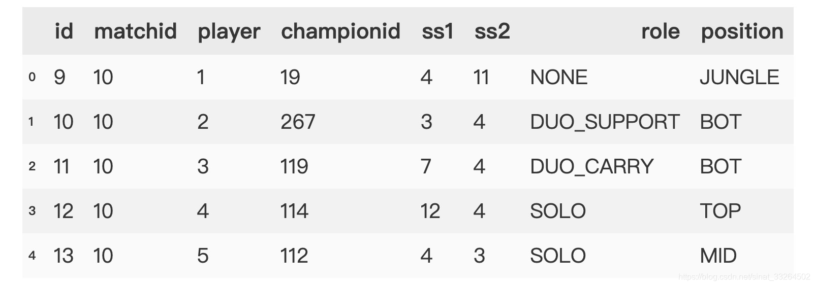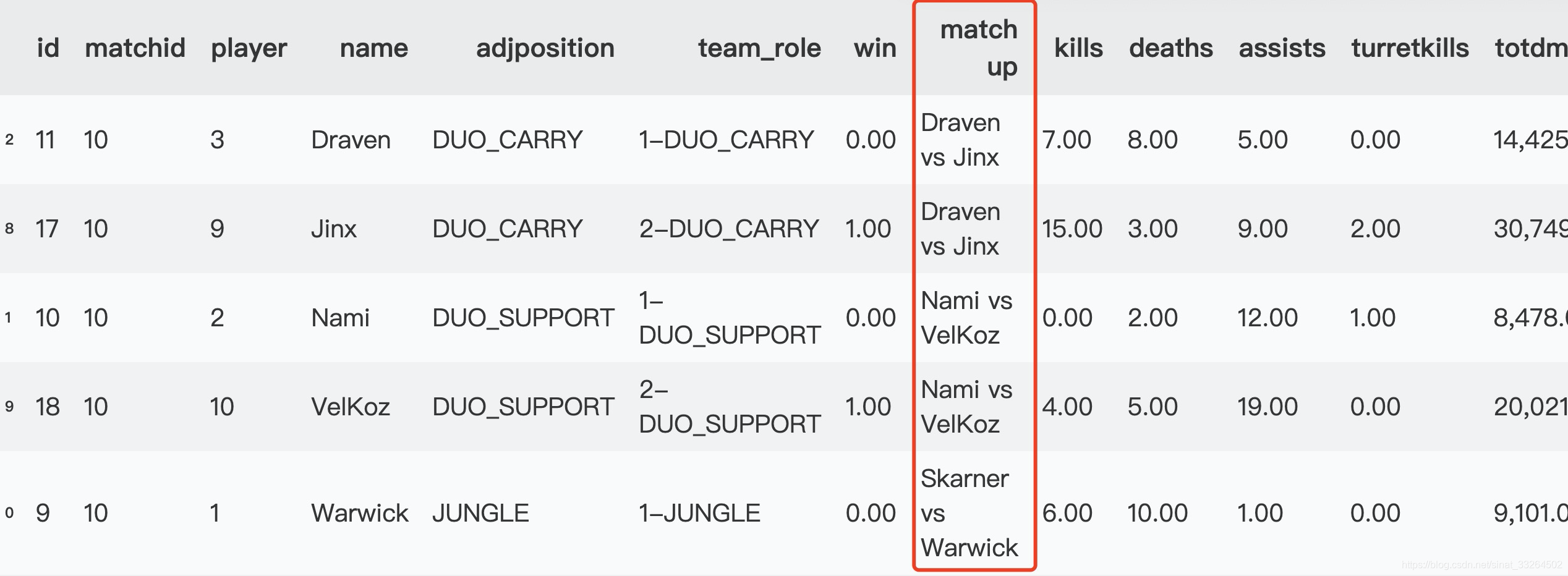 接下来将数据按比赛场次与位置整理,研究英雄对位相关的信息: