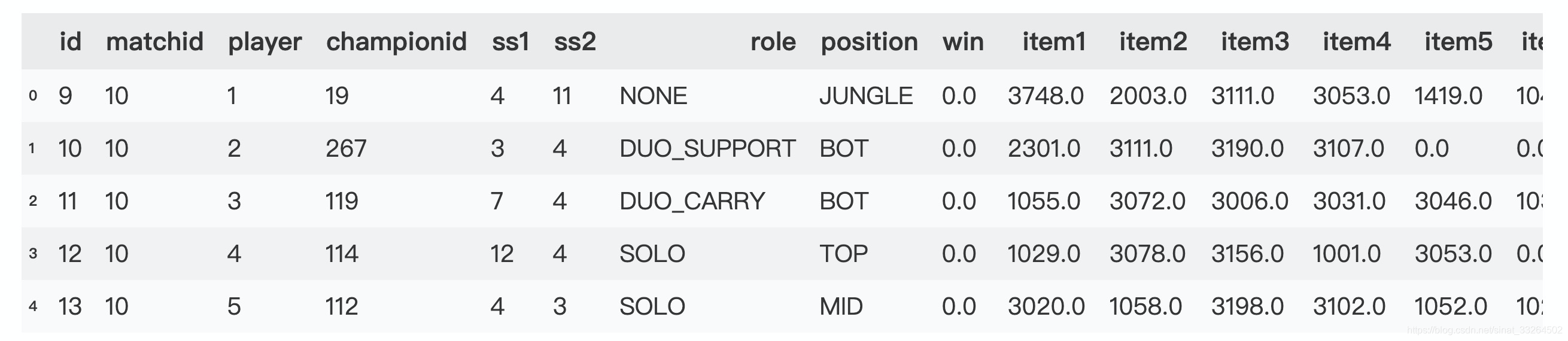 df = df[['id', 'matchid', 'player', 'name', 'adjposition', 'team_role', 'win', 'kills', 'deaths', 'assists', 'turretkills','totdmgtochamp', 'totheal', 'totminionskilled', 'goldspent', 'totdmgtaken', 'inhibkills', 'pinksbought', 'wardsplaced', 'duration', 'platformid', 'seasonid', 'version']]