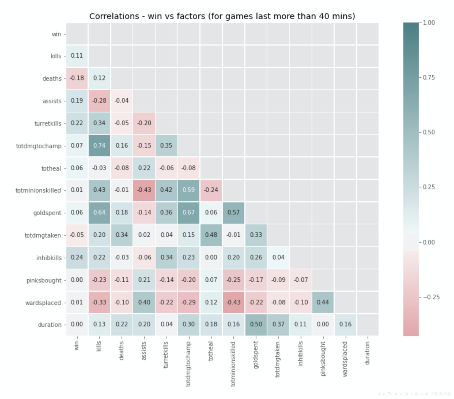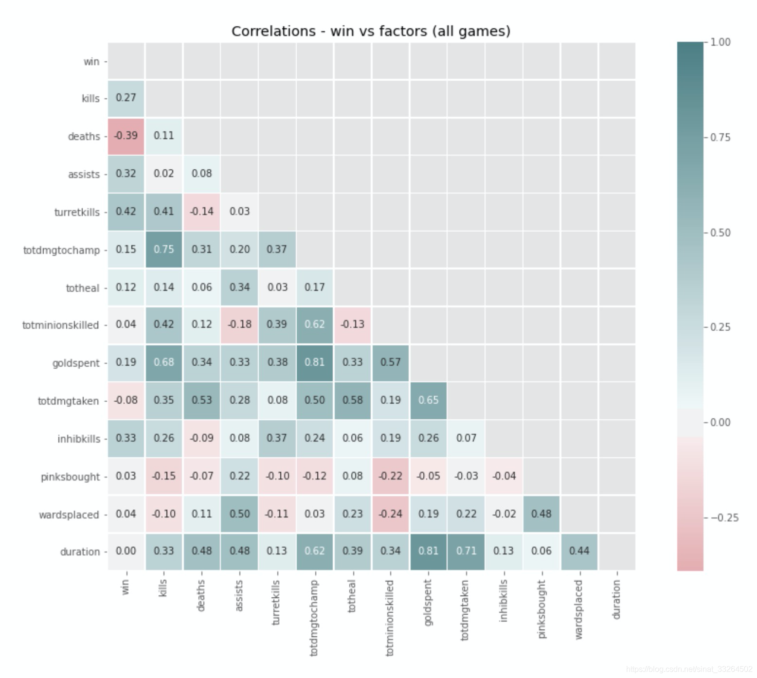接下来看看每个特征与输赢之间的相关性,以及特征之间的相关性: