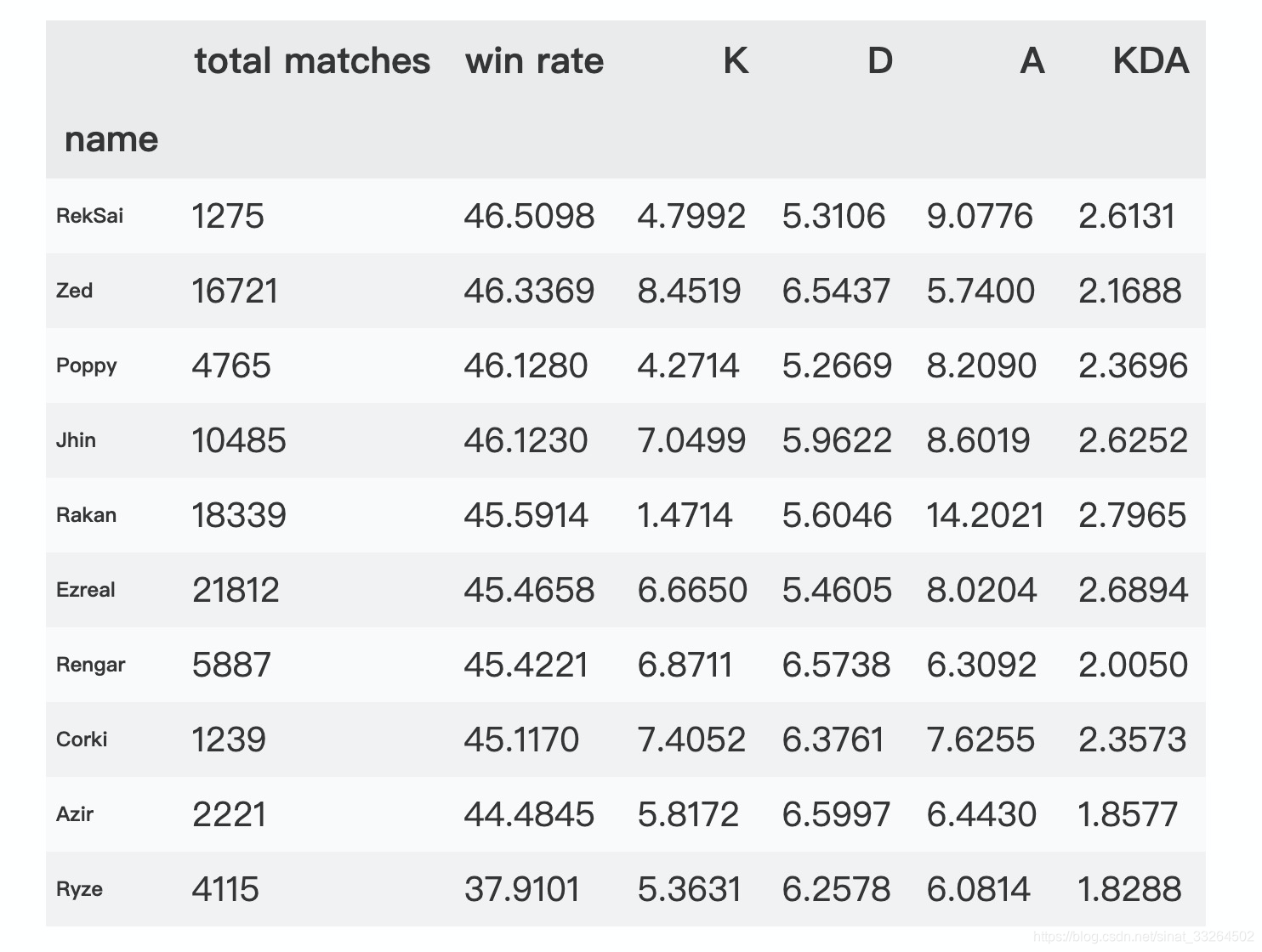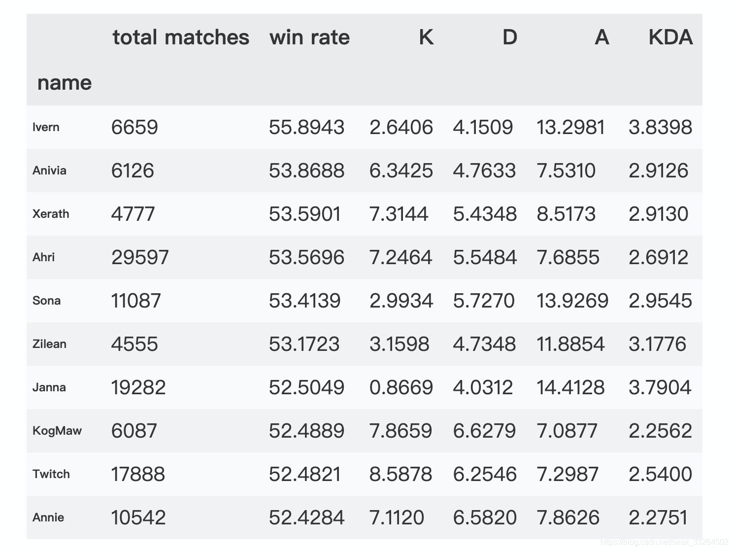 pd.set_option('display.precision', 2)df_win_rate = df.groupby('name').agg({'win': 'sum', 'name': 'count', 'kills': 'mean', 'deaths': 'mean', 'assists': 'mean'})