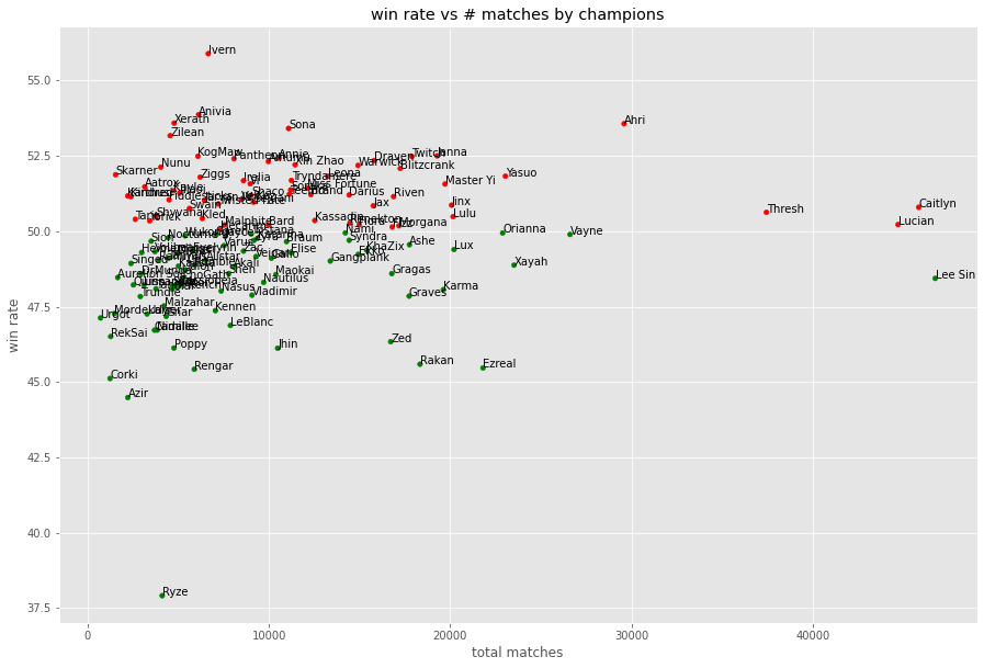 df_win_rate.reset_index(inplace=True)def label_point(x, y, val, ax):a = pd.concat({'x': x, 'y': y, 'val': val}, axis=1)for i, point in a.iterrows():ax.text(point['x'], point['y'], str(point['val']))df_win_rate['color map'] = df_win_rate['win rate'].apply(lambda x: 'red' if x>50 else 'green')ax = df_win_rate.plot(kind='scatter', x='total matches', y='win rate', color=df_win_rate['color map'].tolist(), figsize=(15,10), title='win rate vs # matches by champions')label_point(df_win_rate['total matches'], df_win_rate['win rate'], df_win_rate['name'], ax)