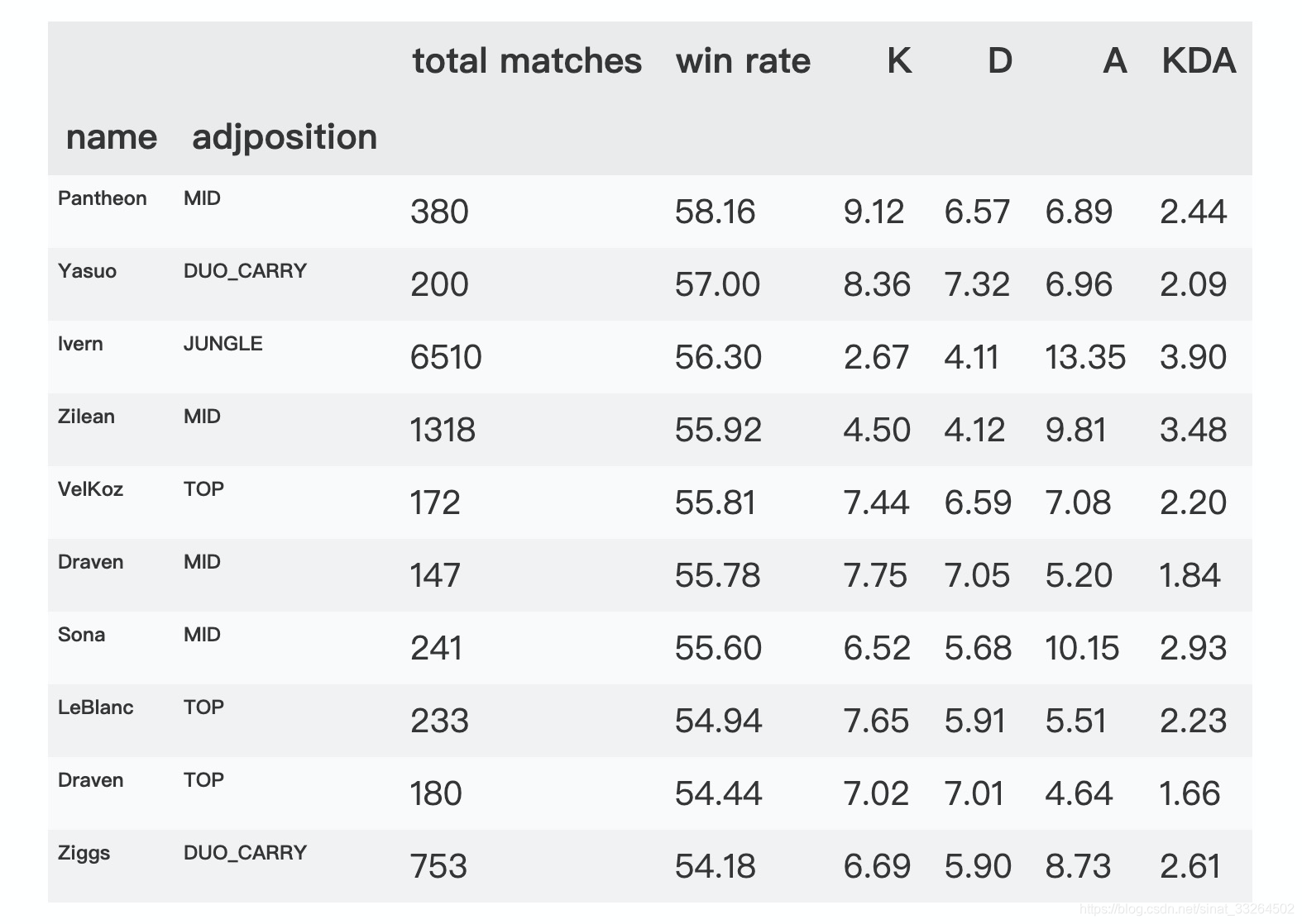 pd.options.display.float_format = '{:,.2f}'.formatdf_win_rate_role = df.groupby(['name', 'adjposition']).agg({'win': 'sum', 'name': 'count', 'kills': 'mean', 'deaths': 'mean', 'assists': 'mean'})