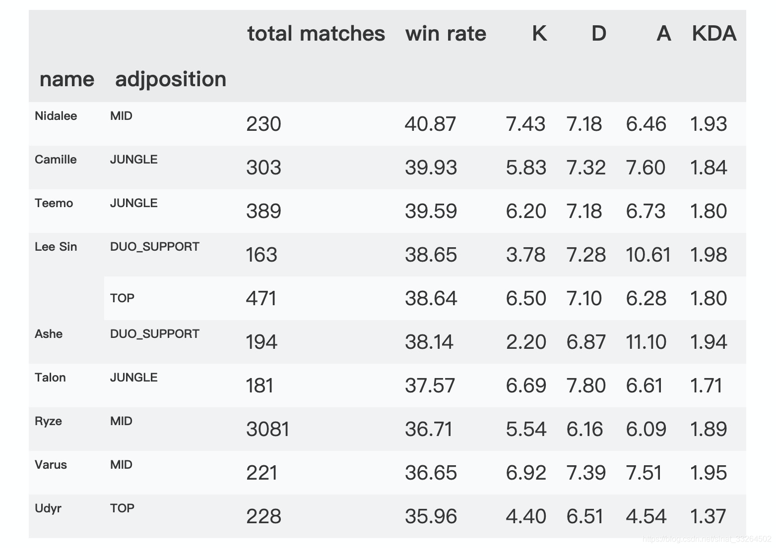 df_win_rate_role = df_win_rate_role[['total matches', 'win rate', 'K', 'D', 'A', 'KDA']]# 只取出场占全部场次0.01%以上的