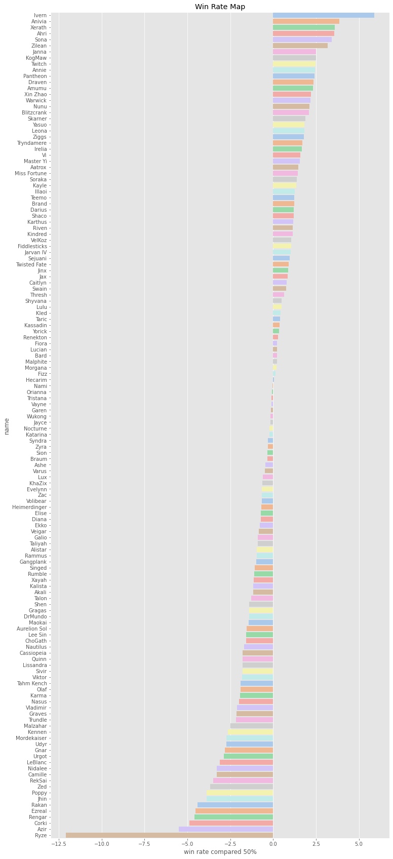 sns.barplot(y='name', x='win rate compared 50%', data=df_win_rate.sort_values(by='win rate', ascending=False),palette='pastel')