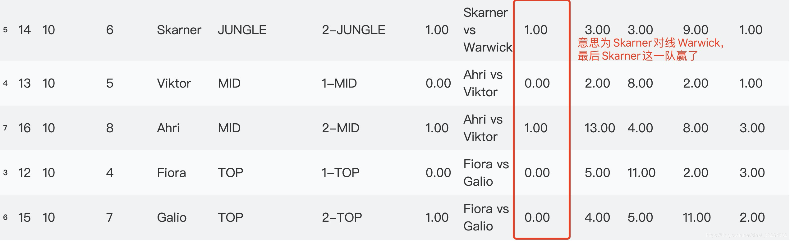 规定胜利方为左方,即为1,否则为0,比如Draven vs Jinx,Draven赢了就为1,Jinx赢了为0: