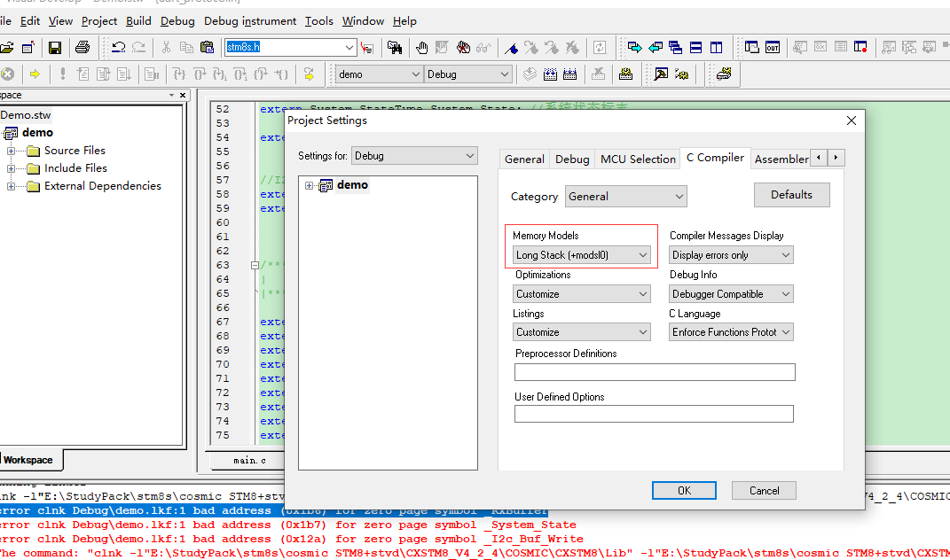 3.修改project settings -> C Compiler -> General ->Memory Models :选择Long Stack[+modsl];