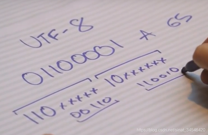 utf-8解决了这些所有的问题,它首先采用ASCII,如果你有128以下的东西,那可以表示用7位二进制数来表示,如果需要更多的表示我就就先写出110,这意味着这是一个新字符的开头,这个字符长度为2个字节,一个字节为8位,而后我们将用10作为延续,在左右的空白的地方可以补充01。