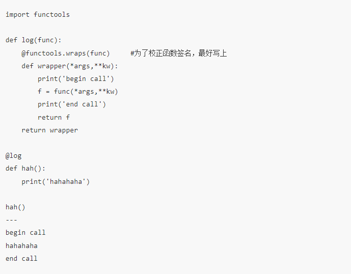 14.装饰器(decorator): 当需要增强函数的功能却不希望修改函数本身,那么可以采用装饰器这种运行时动态增加功能的方式,增加的功能卸载装饰器函数中。如在执行前后打印'begin call'和'end call',可以这样做: