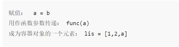 6.Python中一切皆引用。每个对象都有一个引用计数器(内部跟踪变量)进行跟踪,引用计数值表示该对象有多少个引用,当初次产生赋给变量时,引用计数为1,其后没进行下列行为中的任意一种都会增加引用计数: