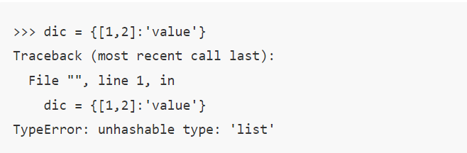 dict:字典类型,存放key-value键值对,可以根据key迅速地找出value,当然,key必须是不可变类型,如下是错误的: