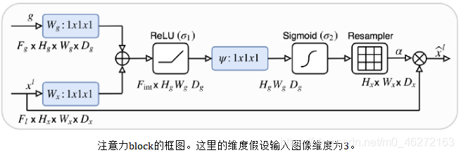 把来自前一个block的输入称为g,以及来自扩展路径的skip链接称为x。下面的式子描述了这个模块是如何工作的。