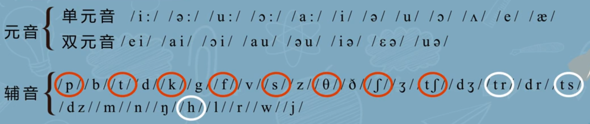 上述将音标分成“噪音”和“乐音”的分法依旧有效,但是给以下用蓝色椭圆圈出另一个名称,“嘶音”。“乐音”,“噪音”和“嘶音”这三种各自遵循一种发音规则