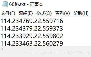 import transfer # 导入transfer.py文件def BusLines(buslist):busname = buslist['key_name'] #线路名buslinename = buslist['name'] #线路名+起终点print(buslinename)fromname = buslist['front_name'] #起点terminalname = buslist['terminal_name'] #终点x = buslist['xs'].split(',')y = buslist['ys'].split(',')busPoint = []for i in range(len(x)):lng,lat = transfer.gcj02_to_wgs84(float(x[i]),float(y[i])) # 转换为wgs84坐标系linetmp = str(round(lng,6)) + "," + str(round(lat,6))busPoint.append(linetmp)return busPointif __name__ == '__main__':linename=['68路']for i in range(len(linename)):city = "440300" #深圳zoom = "11"busNum = linename[i]url="https://www.amap.com/service/poiInfo?query_type=TQUERY&pagesize=20&pagenum=1&qii=true&cluster_state=5&need_utd=true&utd_sceneid=1000&div=PC1000&addr_poi_merge=true&is_classify=true&zoom="+ zoom +"&city="+city+"&geoobj=114.235102%7C22.569015%7C114.276323%7C22.603105&keywords="+busNumresponse = requests.get(url)data = json.loads(response.text)if data['data']['message']=="Successful." and data['data']['busline_list']:buslists = data['data']['busline_list']buslist = buslists[0]buslines = BusLines(buslist)files = open('./公交线路' + busNum + '.txt','w')for i in range(len(buslines)):files.writelines(buslines[i]+'\n')files.close()