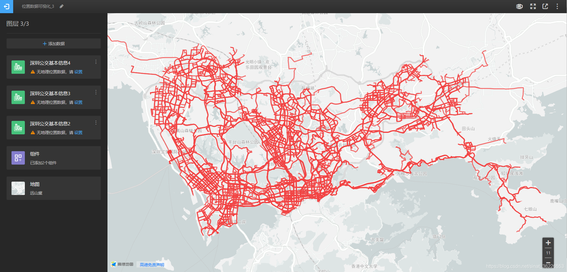 之前只用了一条线做可视化,所以一下就通过ArcGIS做出图来。但想了半天这种格式的多条线数据得用什么可视化/GIS软件来做,结果发现高德就提供了这样的工具:高德开放平台 | Map Lab(唯一的缺点是单个文件不能超过5M,我抓取的深圳公交数据有10M左右,只能拆成几部分加载了,最多3个图层,那文件就不能超过15M了。