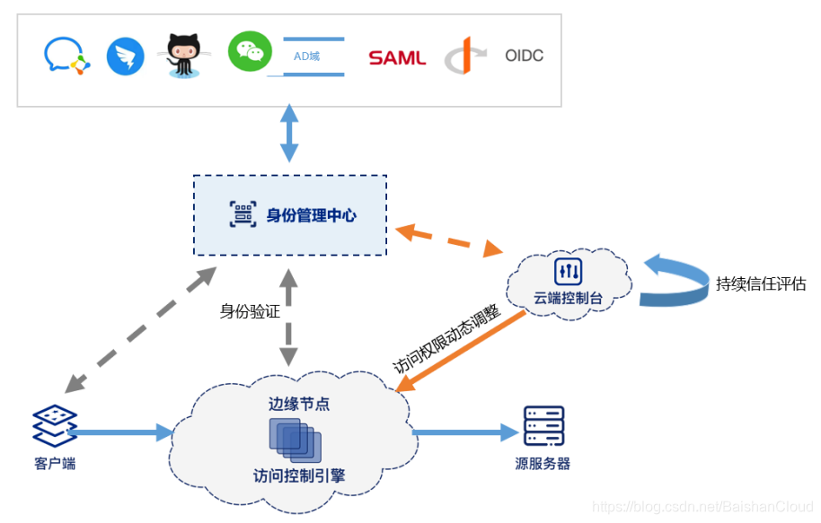身份认证:在YUNDUN边缘安全加速节点上面集成身份认证和访问控制,并通过标准协议与各家的IAM来实现打通,实现外部的身份认证源。目前已经支持钉钉、企业微信、微信等,同时还支持OIDC、SAML 2.0,用户提供身份信息之后安全代理做一些权限的校验来判定他是否有权限访问这个应用;