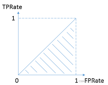 按照定义,AUC即ROC曲线下的面积,而ROC曲线的横轴是FPRate,纵轴是TPRate,当二者相等时,即y=x,如下图: