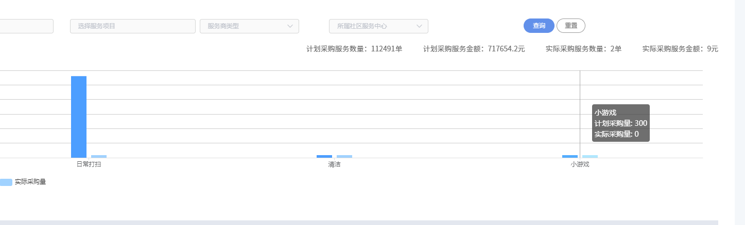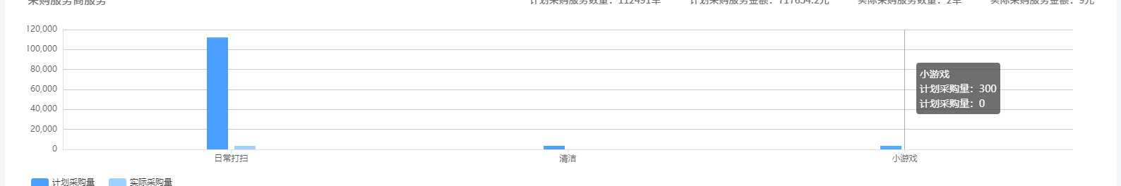 series: [{// 这里筛选值为0时设置为nulldata: arr.map((item) => {return item.purchaseQty == 0 ? null : item.purchaseQty;}),type: 'bar',barMinHeight: 5,}]tooltip: {// 提示的时候,就要替换null的为0trigger: 'axis',formatter: function(params) {return `${params[0].seriesName}:${params[0].value == null ? 0 : params[0].value}<br/>${params[1].seriesName}:${params[1].value == null ? 0 : params[1].value}元`;}}
