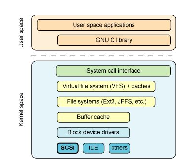 SCSI 子系统在 Linux 内核中的位置:内核的顶部是系统调用接口,处理用户空间调用到内核中合适的目的地的路由(例如 open、read 或 write)。而虚拟文件系统(VFS) 是内核中支持的大多数文件系统的抽象层。它负责将请求路由到合适的文件系统。大多数文件系统都通过缓冲区缓存来相互通信,这种缓存通过缓存最近使用的数据来优化对物理设备的访问。接下来是块设备驱动器层,它包括针对底层设备的各种块驱动器。SCSI 子系统是这种块设备驱动器之一