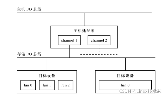 Linux SCSI模型基于传统的并行SCSI。主机适配器连接主机I/O总线(通常是PCI总线)和存储I/O总线(这里是SCSI总线)。一台计算机可以有多个主机适配器,而主机适配器可以控制一个(即所谓的单通道适配器)或多个(即所谓的多通道适配器)SCSI总线,一条总线可以有多个目标节点与之相连,并且一个目标节点可以有多个逻辑单元。