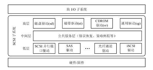 低层驱动器注册和错误处理都由 SCSI 中间层提供。中间层还提供了较高层和较低层间的 SCSI 命令排队。SCSI 中间层的一个重要功能是将来自较高层的命令请求转换成 SCSI 请求。它也负责管理特定于 SCSI 的错误恢复。