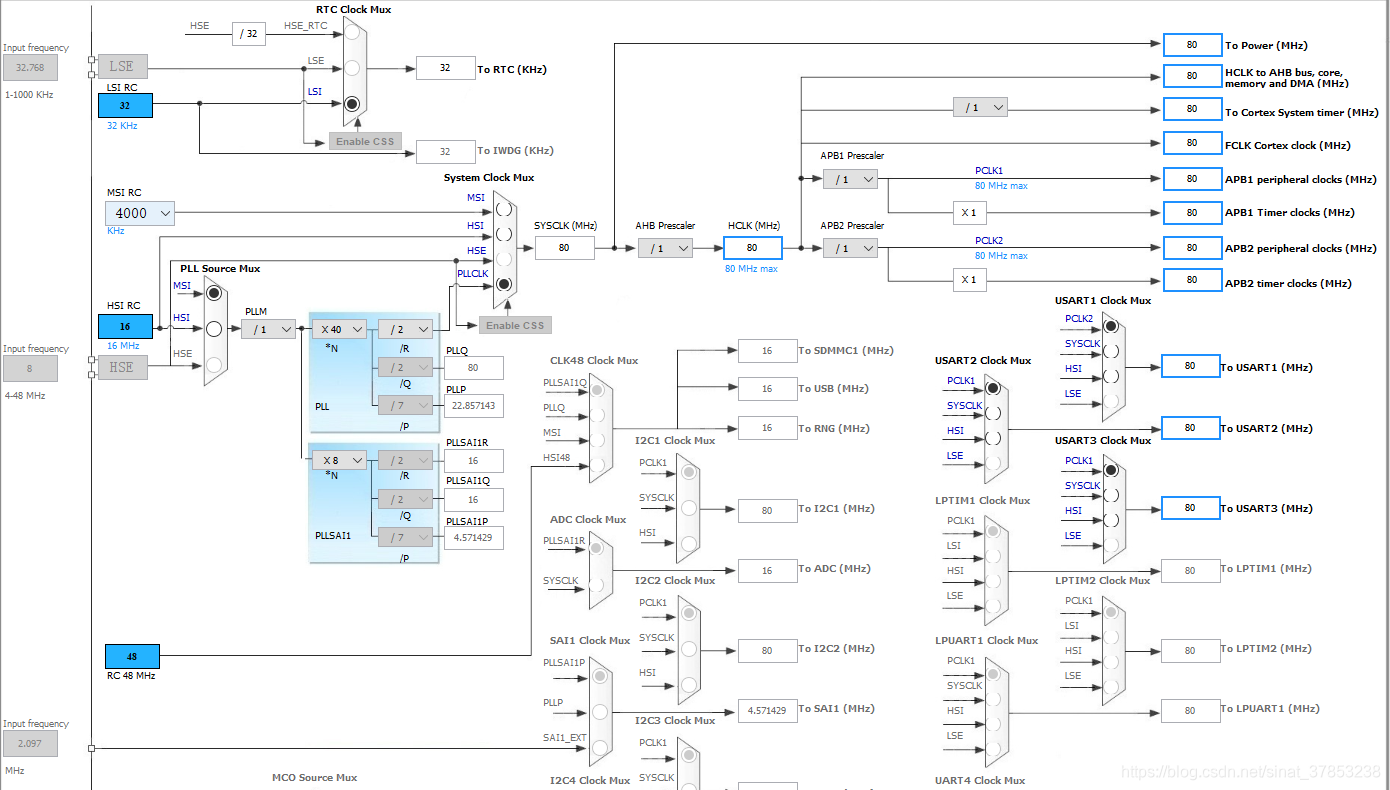 建议选择MSI作为时钟输入源,HSI反应有Bug(没有去尝试过,暂时省略)