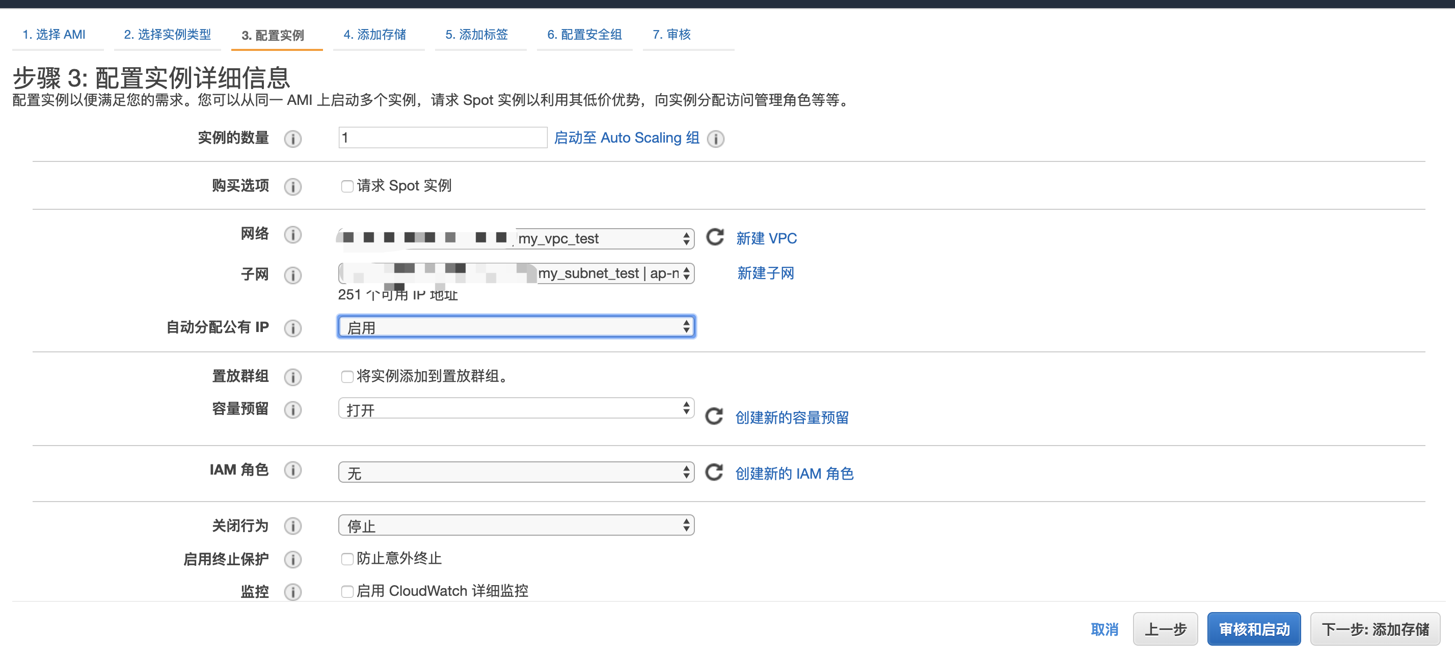在创建EC2实例的时候,选择你所创建的VPC和子网: