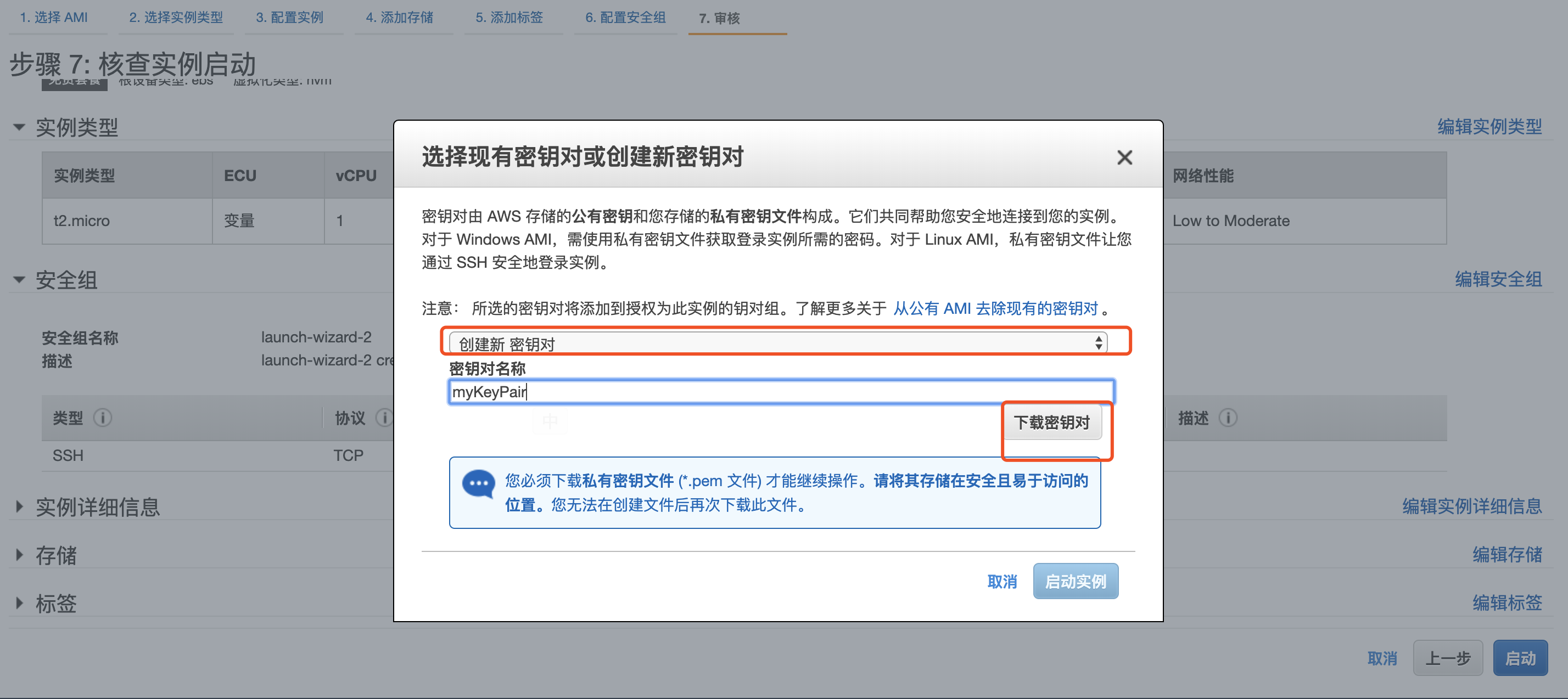 选择创建新密钥对,并将其命名为 MyKeyPair。然后单击下载密钥对按钮。