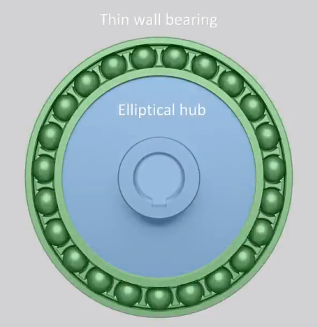 谐波发生器的内侧是一个椭圆形的凸轮,凸轮的外圆上套有一个能够产生弹性形变的薄壁滚珠轴承,轴承的内圈固定在凸轮上,外圈即为谐波发生器的最外面一圈,能够产生弹性形变。
