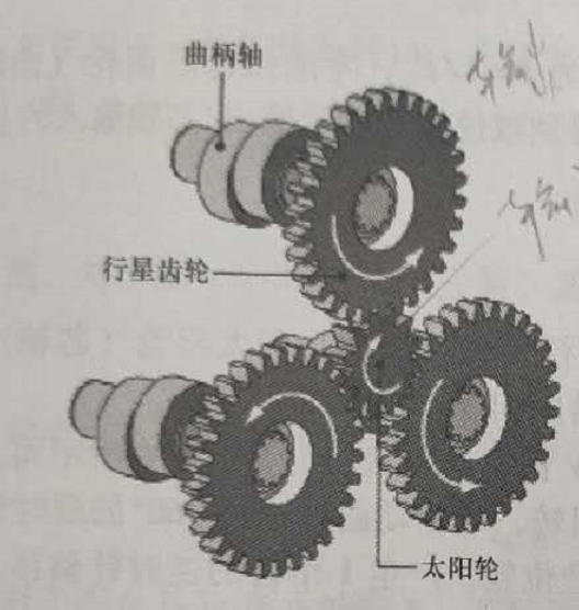 上图是一种非常常见的齿轮减速组成的芯轴层。太阳轮为输入轴,因其在“宇宙中心”,所以叫太阳轮就很形象了。其周围有几个行星轮,因为它们的齿数不一样,齿数越多转动越慢,所以在芯轴层便已经发生了一次减速了,称为一级减速。