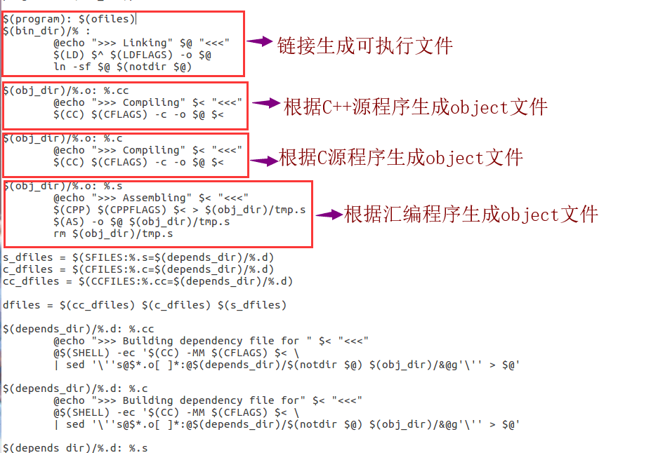 然后利用语句 ifeq ($(uname),xxxx)根据所使用的平台定义相应的宏,为g++所使用,,这些宏主要包括:HOST, arch, CPP, CPPFLAGS, GCCDIR,LDFLAGS 以及 ASFLAGS。