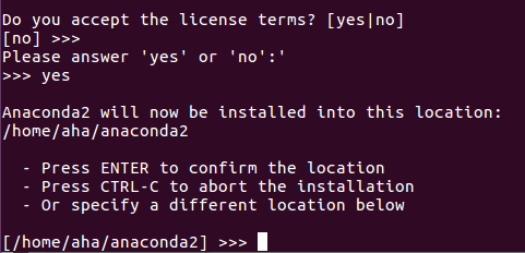 之后就提示要将Anaconda安装在目录/home/yourname/anaconda2下面