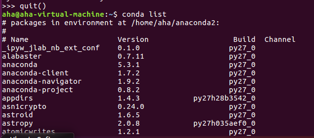 5.退出python环境,输入conda list,会显示一大堆可用的packages,anaconda就在其中。