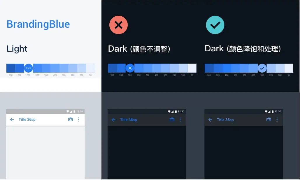设计 Dark Theme 时,尽量避免使用高饱和度的颜色,因为这些颜色会在深色背景上产生视觉抖动,导致人眼产生疲劳。以 Trip.com 的品牌蓝为例,若颜色不做调整,直接展示在深色背景上,不仅信息的清晰度降低了,而且识别的费力度还增高了。这显然不是我们所希望的,所以在 Dark Theme 下我们选择更低饱和的颜色来达到更好的可读性。