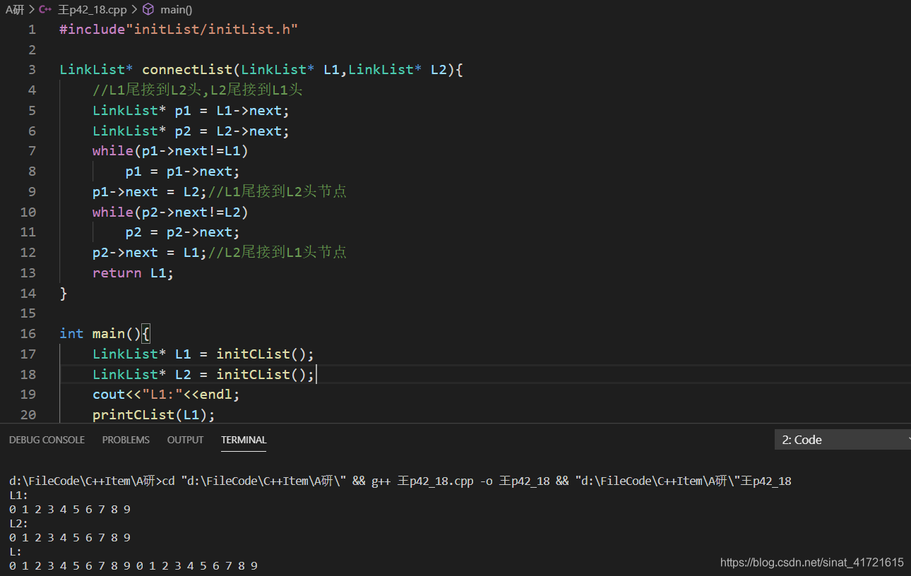 LinkList* connectList(LinkList* L1,LinkList* L2){//L1尾接到L2头,L2尾接到L1头LinkList* p1 = L1->next;LinkList* p2 = L2->next;while(p1->next!=L1)p1 = p1->next;p1->next = L2;//L1尾接到L2头节点while(p2->next!=L2)p2 = p2->next;p2->next = L1;//L2尾接到L1头节点return L1;