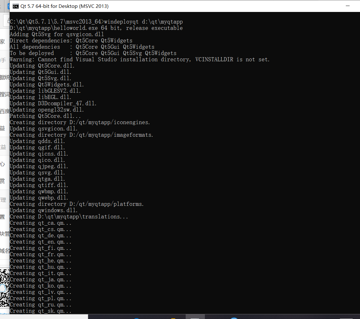 2、从开始菜单启动 Qt 5.7 64-bit for Deskop命令行工具,运行windeployqt d:\qt\myqtapp如下图