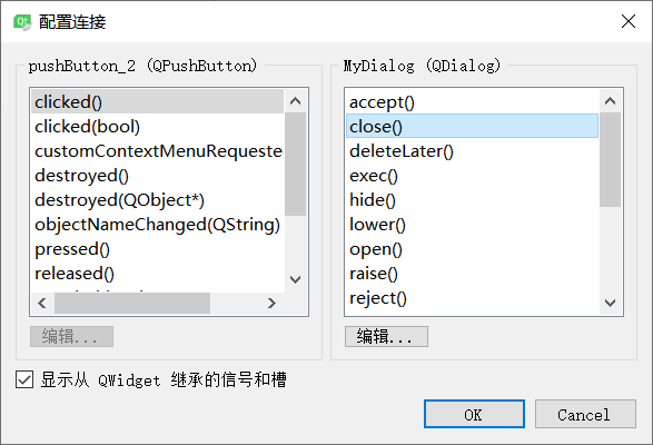 勾选“显示从QWidgt继承的信号和槽”,左边选择clicked,右边选择close,单击ok 。这时退出按钮的单击信号就和对话框中的操作进行了关联。