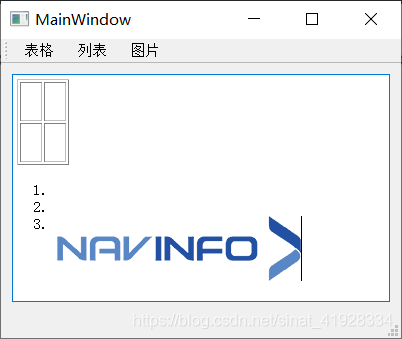 有代码可知表格使用QTextTableFormat和insetTablle,列表使用QTextListFormat和insertList,图片使用QTextImageFormat和insertImage。