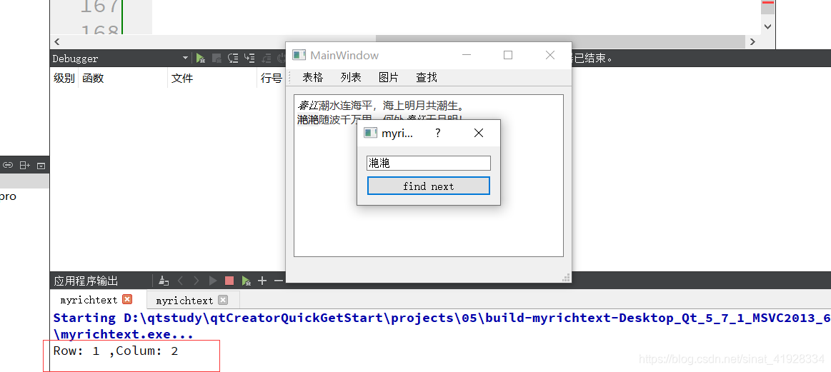 {QString string=lineEdit->text();//使用查找函数查找指定字符串,查找方式为向后查找bool isFind=ui->textEdit->find(string);if(isFind){qDebug()<<"Row:"<<ui->textEdit->textCursor().blockNumber()\<<",Colum:"<<ui->textEdit->textCursor().columnNumber();}}