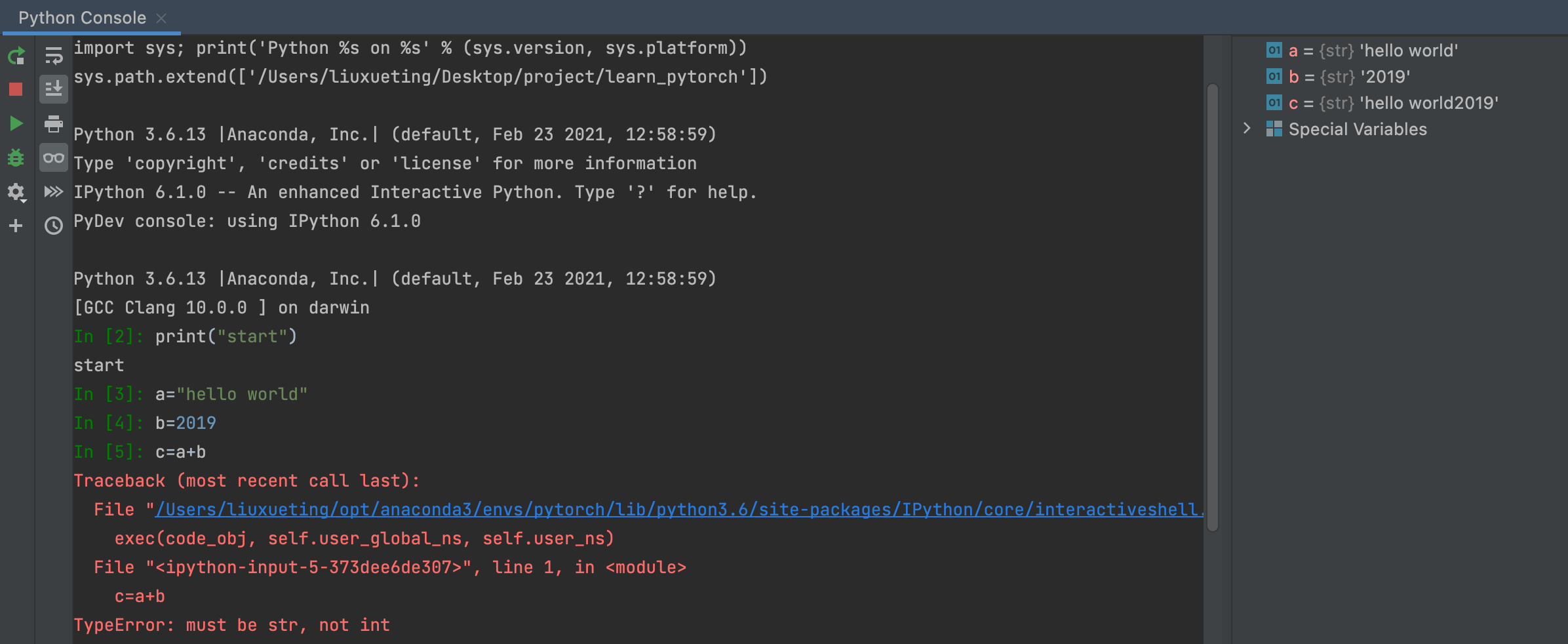再来看一下Python 控制台,在c=a+b时出现错误,对b进行一个整改,执行正确,但这样带来的问题是:明显不利于阅读与修改