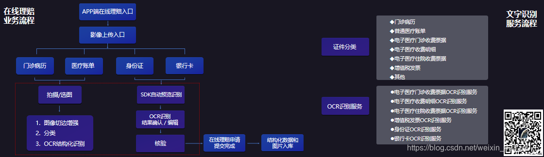 目前OCR方案可以对保险客户在理赔环节提交的个人证件(身份证、银行卡、护照、军官证、户口本等)以及医疗票据(门诊发票、住院发票、费用清单、出院小结等)进行自动分类归档和结构化识别录入,保险企业将此技术方案应用到本公司的投保、理赔等移动端APP、小程序等业务前端系统中,用户只需在系统中拍摄上传理赔材料,系统自动将理赔材料分类、识别后让用户点击确认即可,后台人员可对有问题的材料进行修正、复核等人工处理,逐步实现快速、智能理赔的业务效果。