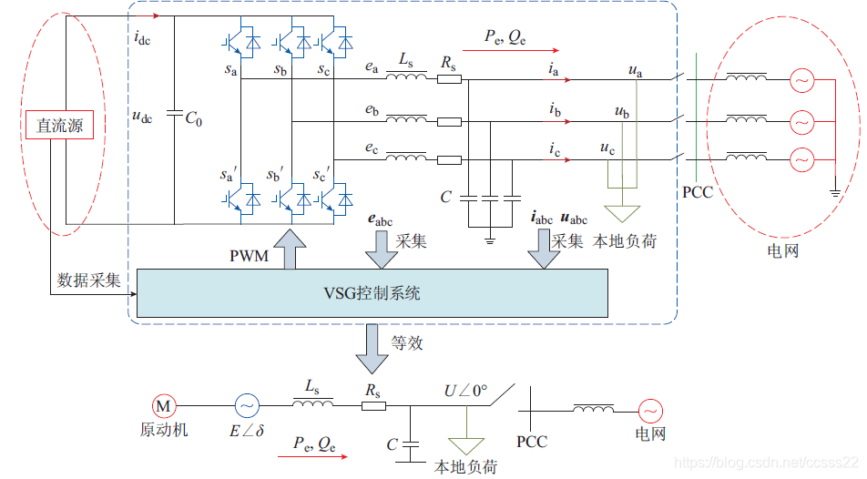 虚拟同步发电机的本质是通过控制逆变器模拟同步发电机的工作原理,从而获得类似同步发电机的运行特性,其基本拓扑结构如下图