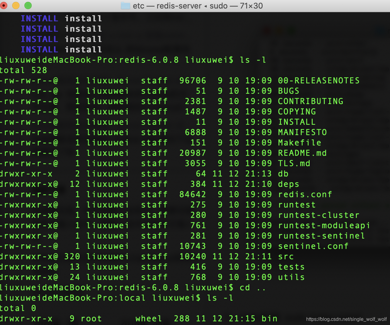 4. 终端进入 文件夹 cd /usr/local,然后切换成root 权限:su root,然后进入 redis-6.0.8文件夹: cd redis-6.0.8/
