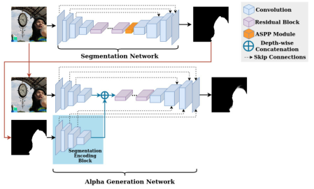本文使用一种无额外输入且使用GAN的方法进行人像抠图。分为两个网络:一个分割网络用于生成粗略的人物分割mask和一个alpha生成网络用于alpha图预测。