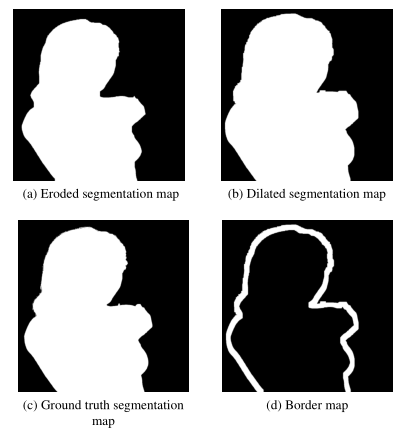 得到腐蚀分割图(a)和膨胀分割图(b)。然后相减得到边界分割图(d)。