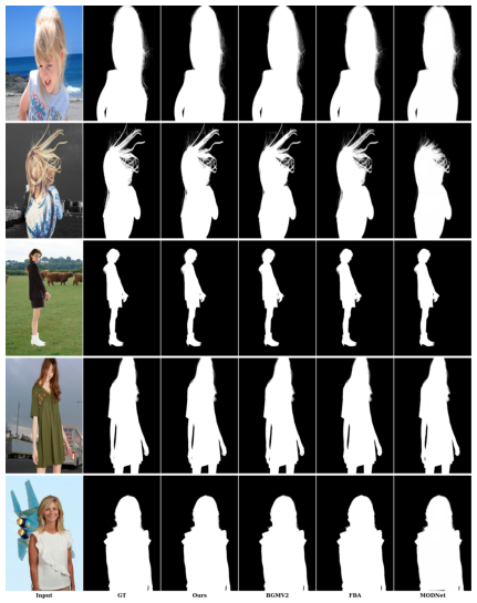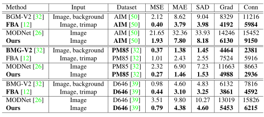 该方法优于同样采用单一输入的MODNet方法。同时获得了与需要额外输入的BGM-V2和FBA方法相当的结果。